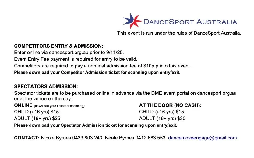 Professionals interested in volunteering their adjudicating services should email dancemoveengage@gmail.com. We look forward to seeing you all for our final event in 2025 to use in preparation for the Aussies!